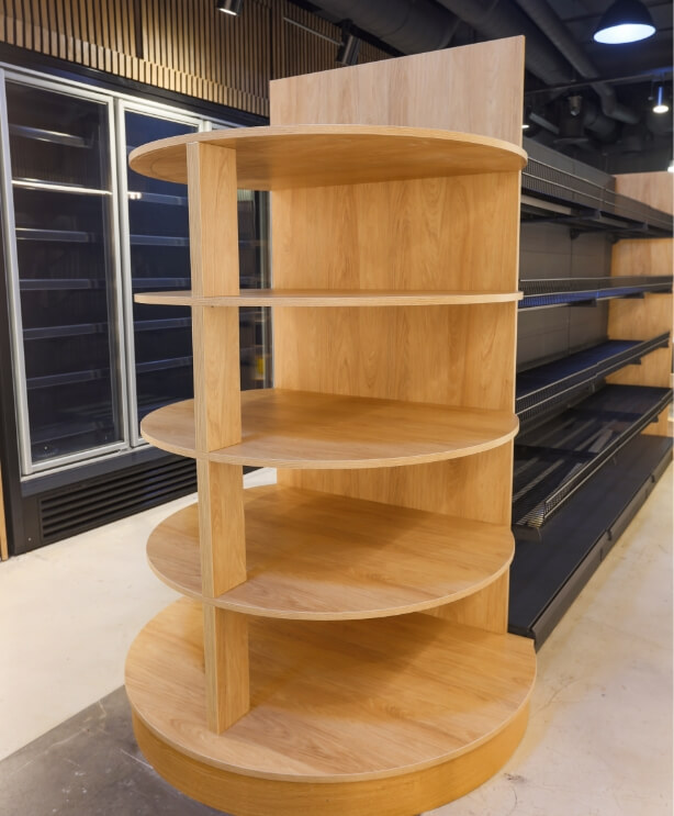 This area is for displaying the client’s bakery products. We created a bespoke storage and display solution that takes into consideration the awkward floor space and ensures the client’s products are well displayed and every CM of space is utilised.