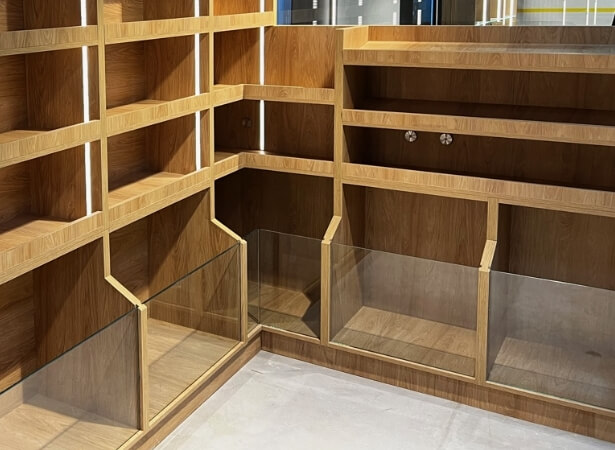 We installed wooden cladding around most walls in the shop. The cladding along with our bespoke joinery created a great design that consistently carries out throughout.