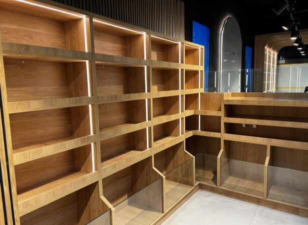 We also added built-in LED lighting all around so that the client’s products are well lit, and we added bottom glass partitioning.