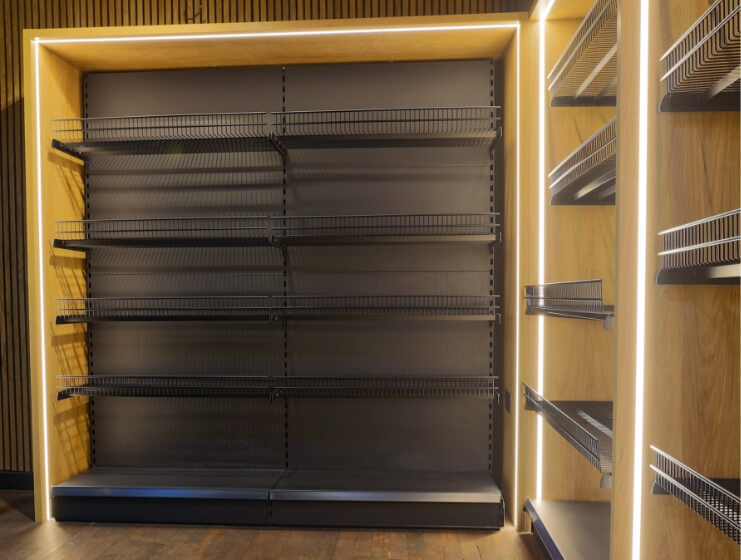We created bespoke frames for the shelving. The frames carry the same design as the shop and have built-in LED lighting.