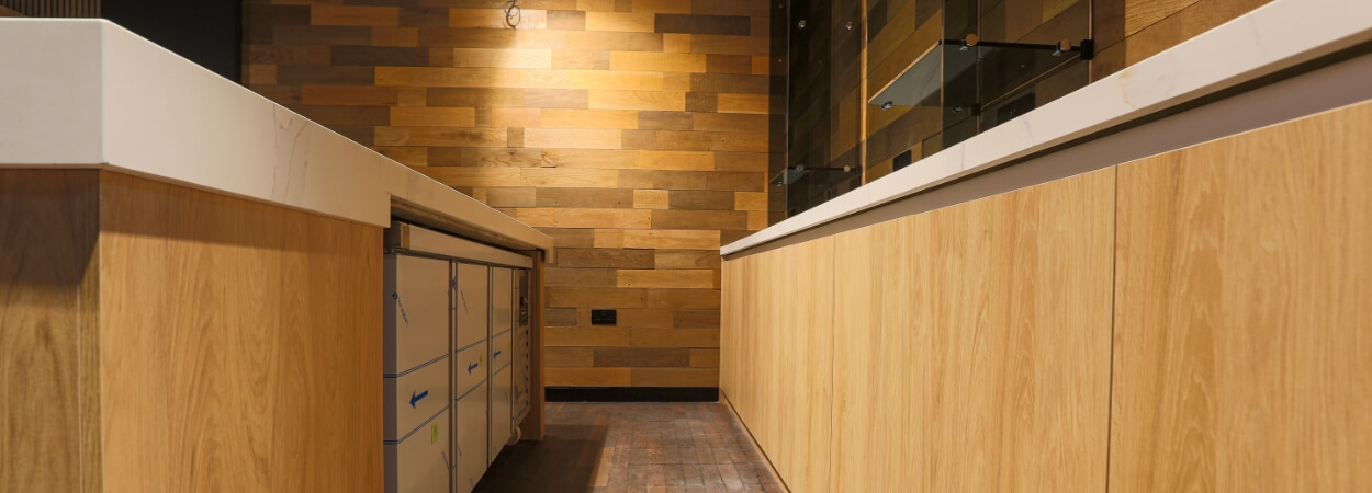 We manufactured a large number of cupboards for the client to store products and stock, complete with soft-closing doors and shelving inside.